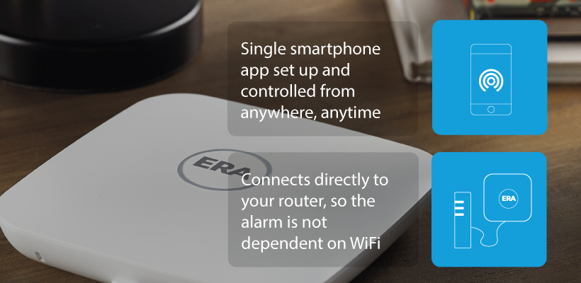 System requirements: A compatible iPhone or Android device (minimum OS for Android and iOS – Android 7 & iOS11, ERA Protect app from iTunes or Google Play and an Internet Connection). For internet connectivity a spare Ethernet port (RJ45 connector) on your router is required. The ERA Protect Plus service required for use of pre-installed SIM card for SIM back up or SIM only mode.