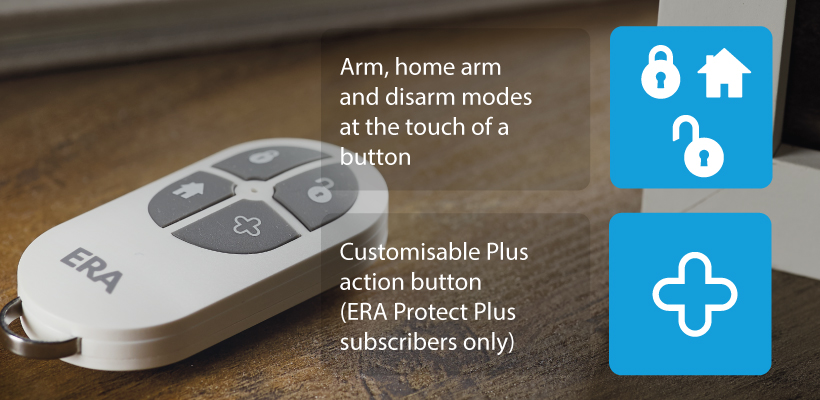 The two-way wireless communication and the built-in LED indicator confirms use of the remote and the Plus Action button is customisable to your requirements (ERA Protect Plus members only).