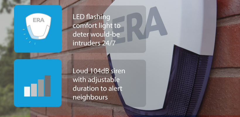 The brightly coloured siren provides a strong visual deterrent for the outside of your property. The comfort flashing lights 24/7 indicate to any potential intruders that the alarm system is live.